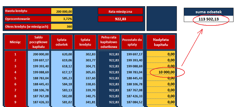 Wystarczy w kolumnie Nadpłata kapitału wpisywać kwoty, które chcemy przeznaczyć na wcześniejszą nadpłatę kredytu. Nadpłat kredytu możemy dokonywać wielokrotnie w różnym czasie, za każdym razem wpisując konkretną kwotę w kolumnie Nadpłata kapitału.